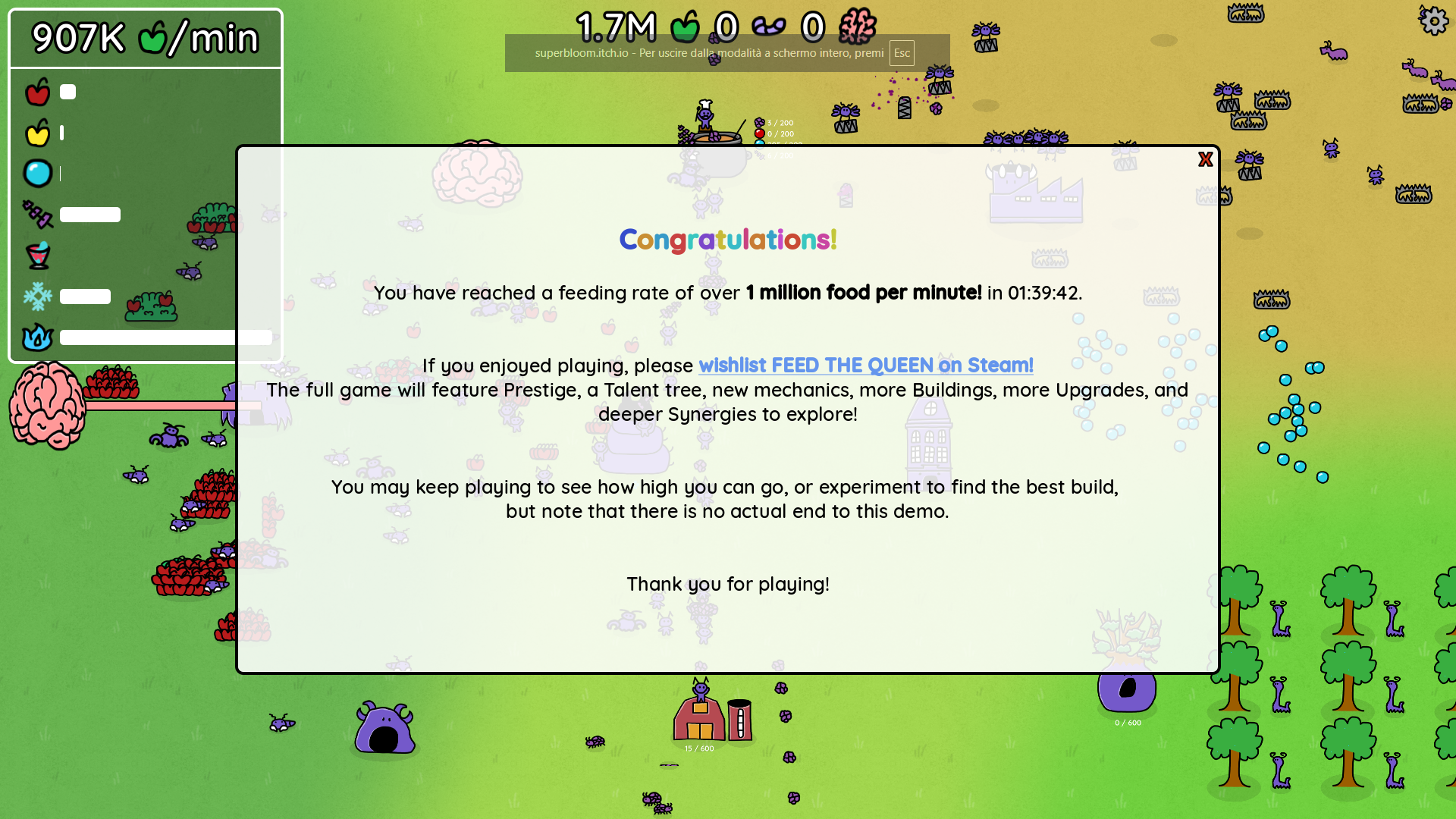 Fun game, I hit a bit of a roadblock that was demoralising just before I hit the 500k threshold. I think it was a poor choice of upgrades I couldn’t do anything about. It sounds like you’re going to have the ability to prestige in the full release, so if I could have done that, or refunded some of the brain purchases… I think it would have felt more satisfying.